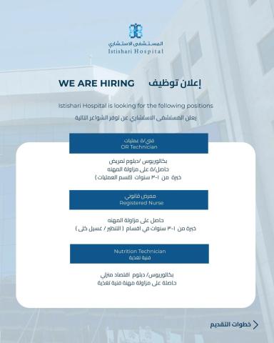 على جميع المهتمين بهذه الوظائف تقديم طلباتهم عبر الموقع الالكتروني www.istisharihospital.com باتباع الخطوات أدناه.