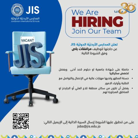 تعلن المدارس الأردنية الدولية JIS عن حاجتها لتعيين مرافقات باص وفق الشروط المرفقة