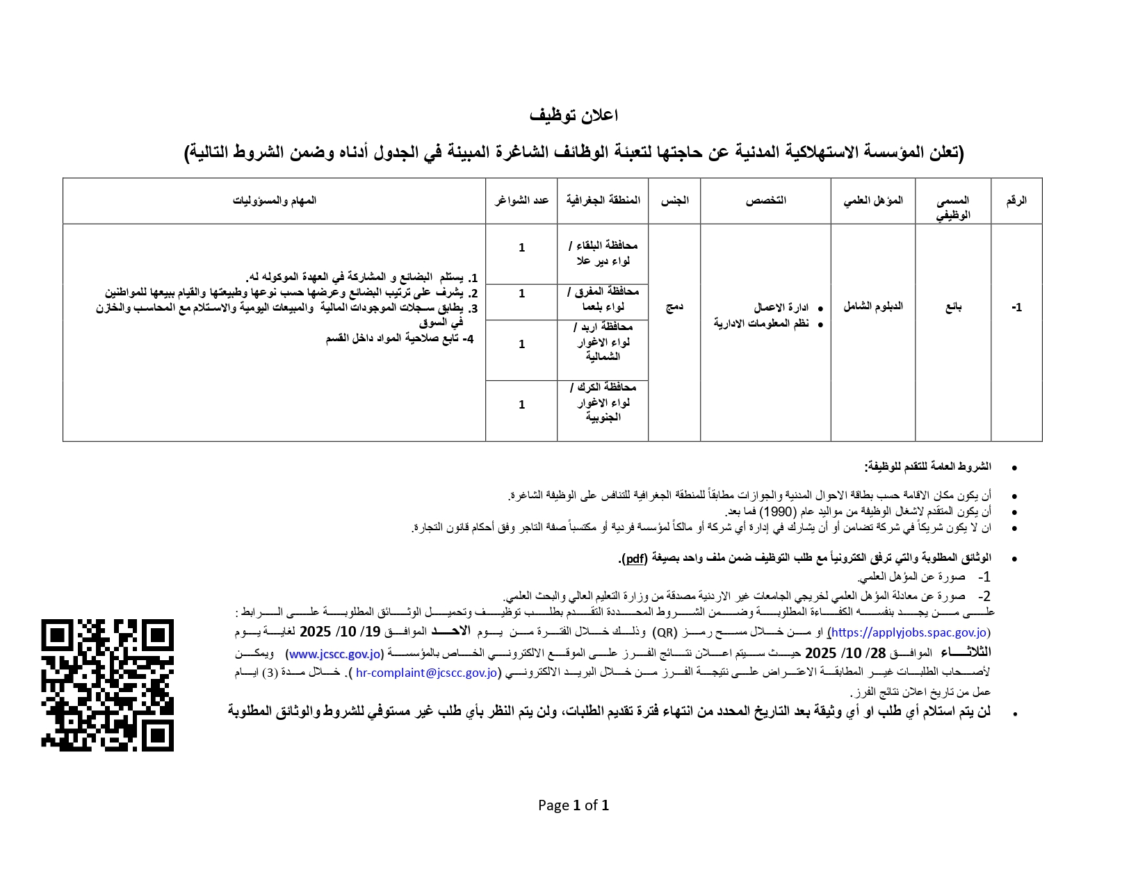 تعلن المؤسسه الاستهلاكيه المدنيه عن حاجتها إلى تعيين بائع