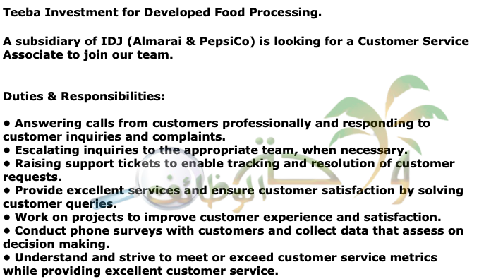 تعلن شركة طيبة للصناعات الغذائية عن حاجتها الى موظف اداري