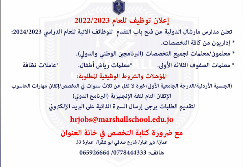 تعلن مدارس مارشال الدولية عن فتح باب التقدم لوظائف ادارية وتعليمية وفنية للعام الدراسي 2023 - 2024