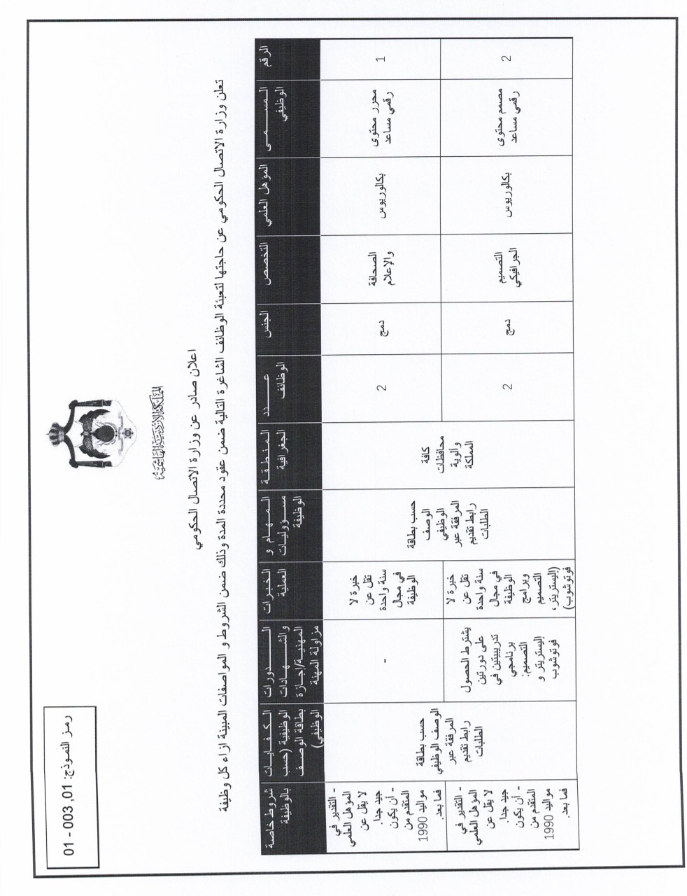 تعلن وزارة الاتصال الحكومي عن توفر عدد من وظائف شاغرة للتقديم عبر الرابط التالي
