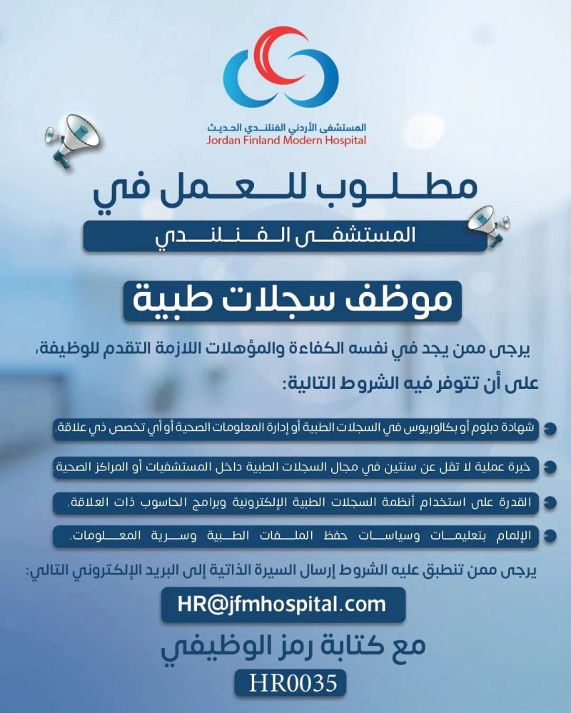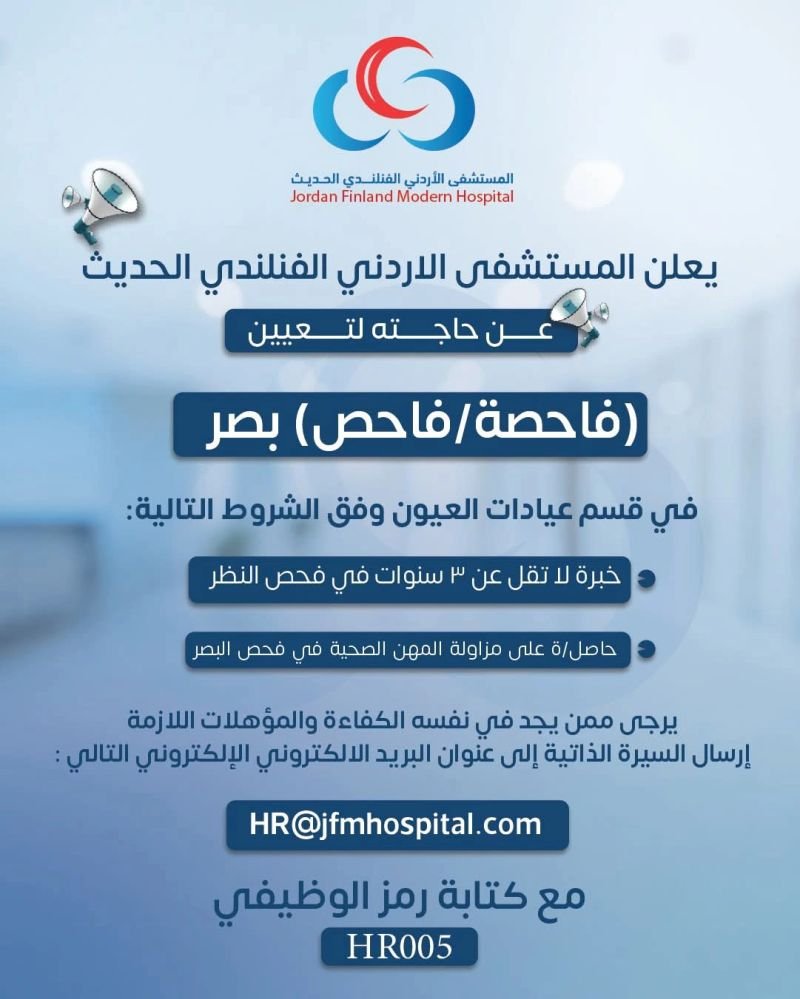 يعلن المستشفى الاردني الفنلندي الحديث عن حاجته لتعيين الوظائف التالية