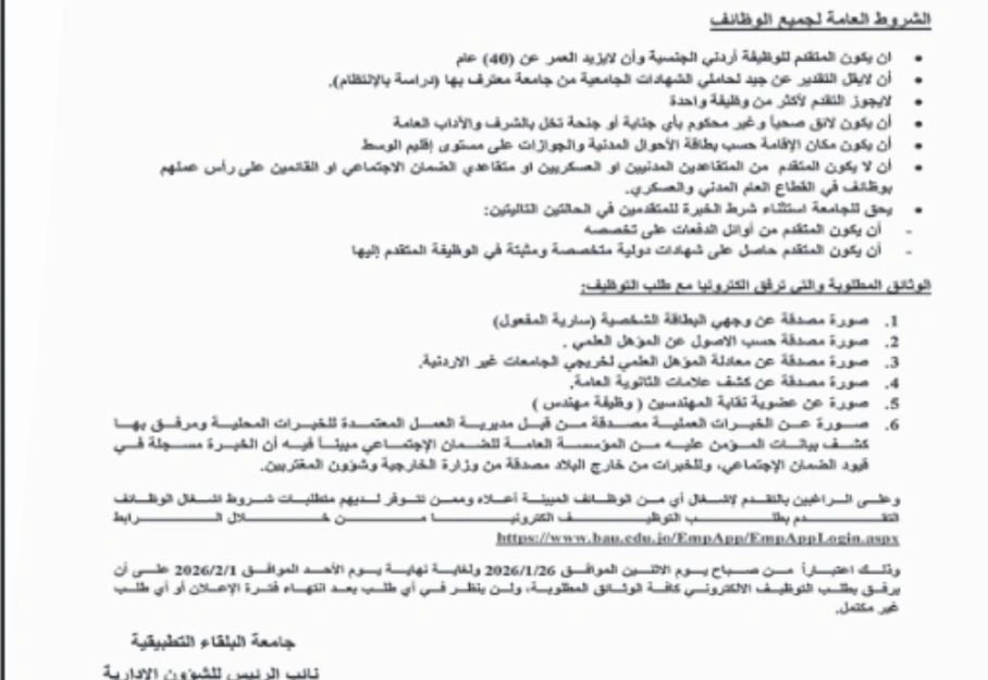 تعلن جامعة البلقاء التطبيقية عن حاجتها لتعبئة عدد من الوظائف الشاغرة