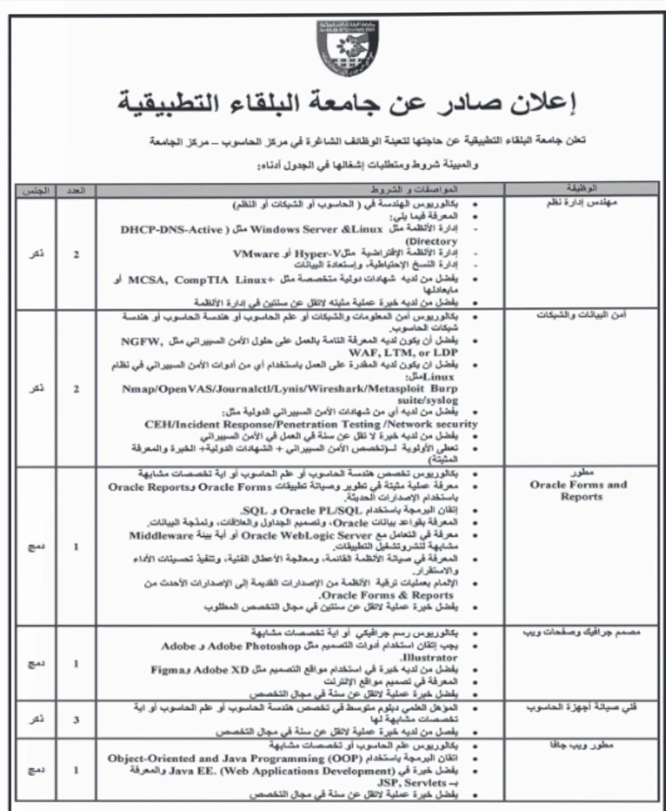 تعلن جامعة_البلقاء_التطبيقية عن حاجتها لتعبئة الوظائف_الشاغرة التالية في مركز الحاسوب للتقديم على موقع الجامعة